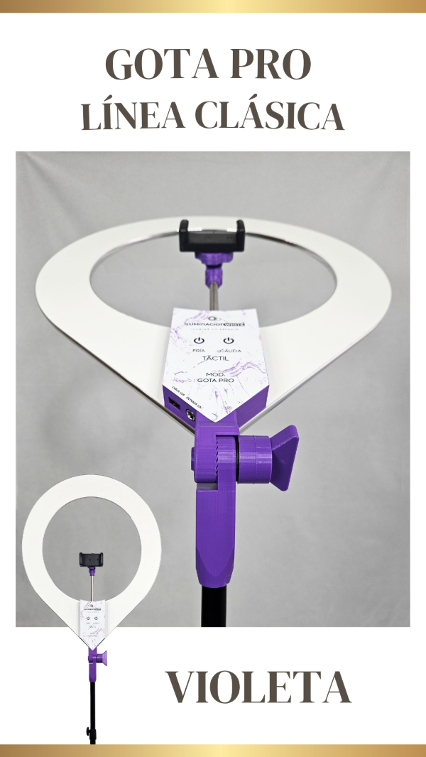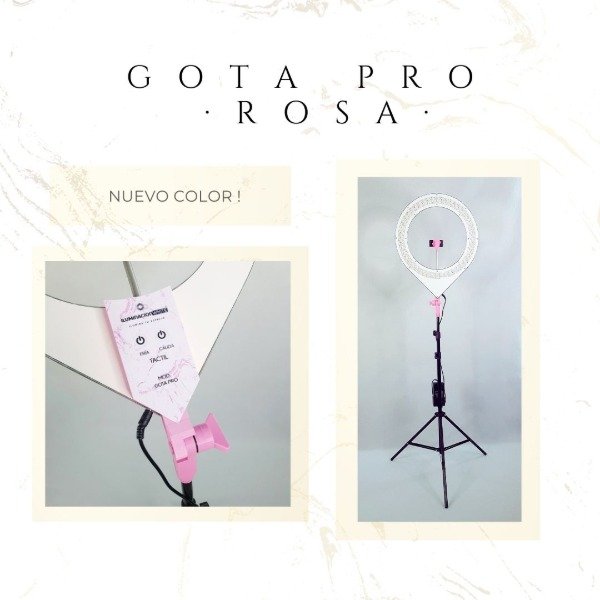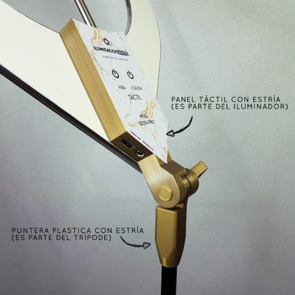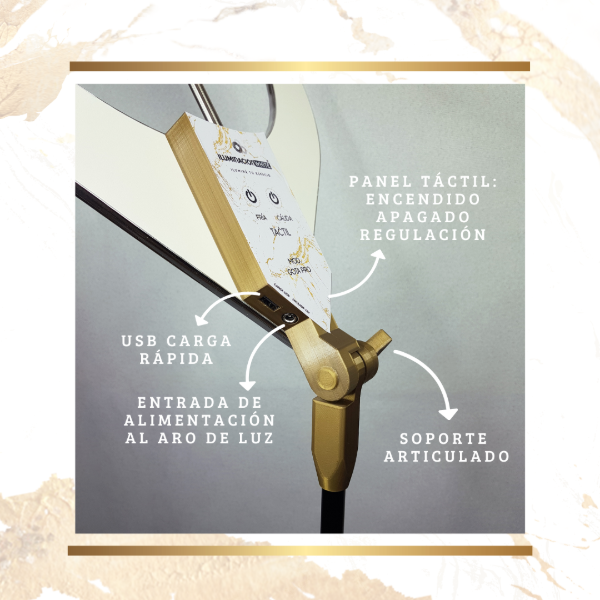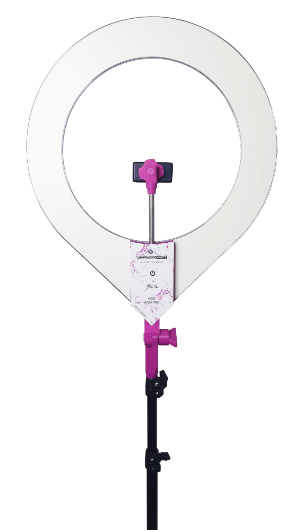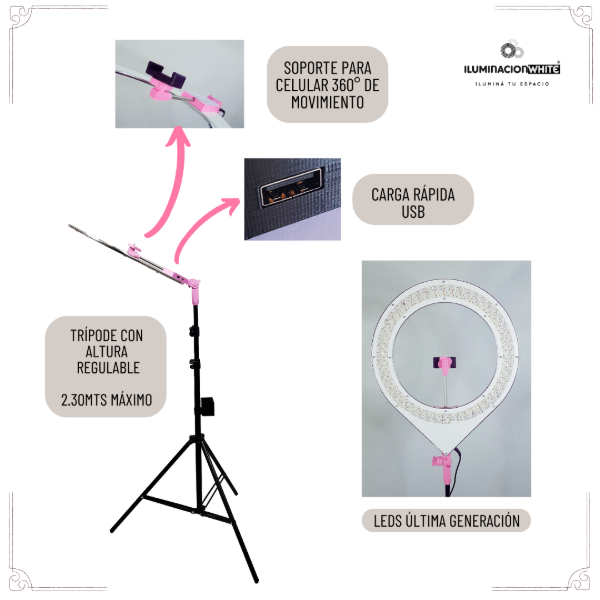 Incluye trípode recto articulado, altura máxima 2.30 mts, soporte celular 360°, transformador 220v a 12v con soporte, encendido y regulación táctil.